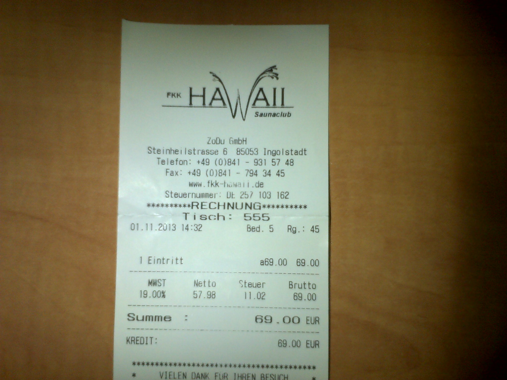 Visto che qualche mese fa avevo avuto una discussione con alcuni utenti riguardo questo argomento, ho deciso di allegare una copia dello scontrino d'ingresso del Fkk Hawaii dalla quale si evince chiaramente come in Germania questo mercato sia regolarmente tassato come qualsiasi altra attivita'. Come si puo' vedere sono espressamente indicati percentuale ed importi delle tasse (equivalentedella nostra IVA). Se noi popolo italiano ci vogliamo svegliare forse e' ora e non ancora troppo tardi...