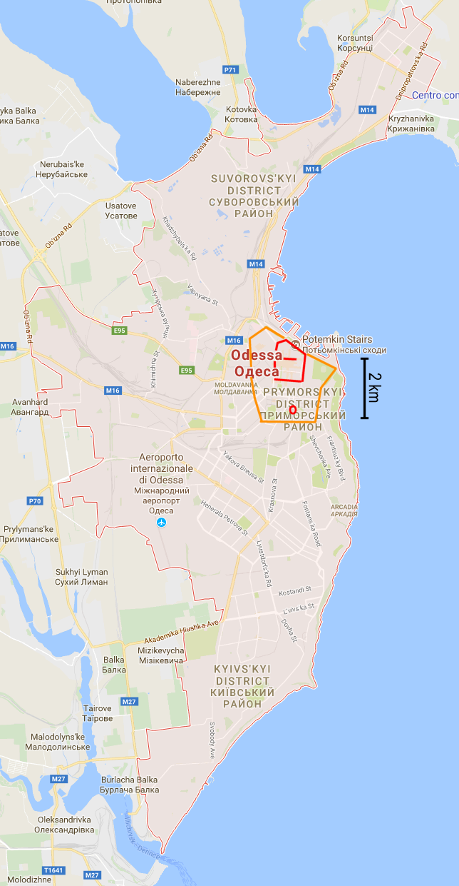 E' una città viva. Il centro la sera è pieno di vita. Certo, parliamo di estate, ma quanti posti sono mortori anche d'estate? E' una città a misura d'uomo. Nella cartina ho bordato in rosso il "centro" e in arancione il "semicentro" (il cerchietto è la stazione ferroviaria). Tutta questa parte di trova su un rilievo ad "altopiano" (quindi senza salite e discese che odio) e si scende solamente dalla parte del mare (a nord e a est) e un pochino dalla parte della tangenziale ovest, Tutta la zona del centro e semicentro è fatta di palazzine, non ci sono i famigerati "blocchi". Chiaramente i "blocchi" ci sono in periferia, soprattutto nella grande periferia a nord, verso Mykolaiv, che è quasi una cittadina satellite a parte.