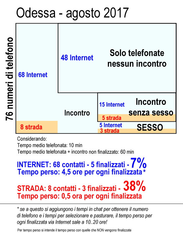 Nei giorni di Odessa ho contattato telefonicamente un totale di 76 donne. Di queste 68 donne conosciute via Internet (23 prima del viaggio, 45 durante il viaggio) e 8 donne rimorchiate dal vivo, che hanno dato il telefono.