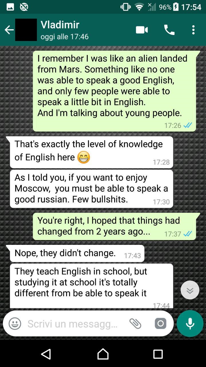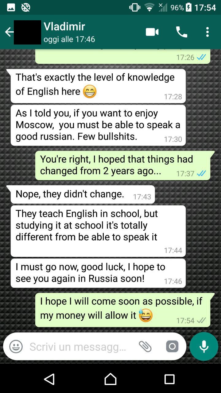 Per rimorchiare può bastare l'inglese ? Sì ma almeno di buon livello, poi se vi incontrate e volete provare a usare il traduttore fatelo...ma io personalmente usare il traduttore lo trovo avvilente solo e soltanto per fare la trombatina con la 6-6,5 du turno che pochi si calcolano qui a Mosca.