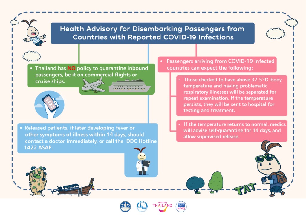 Sotto ho copiato le indicazioni che ci sono sul sito del ambasciata thai che dicono che non c'è nessuna quarantena dicono solo che chi arriva dai paesi che hanno indicato compresa Italia si viene controllati se si ha la febbre si viene portati in ospedale e controllati e poi eventualmente c'è una quarantena di 14 giorni