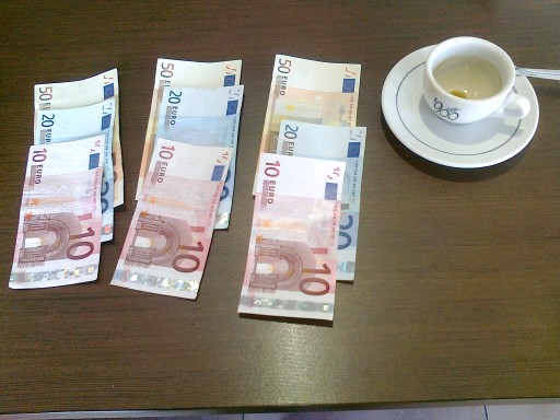 Prima di partire per la ventura avevo prelevato ad un bancomat che probabilmente era stato rifornito in maniera… eccentrica, che mi aveva rifilato trecento euro tutti in pezzi da venti; quindi annaspo verso il portafoglio, con il birillo sull’attenti, per trovare i soldi da dare alla girl, ed nella foga estraggo CINQUE pezzi da venti.