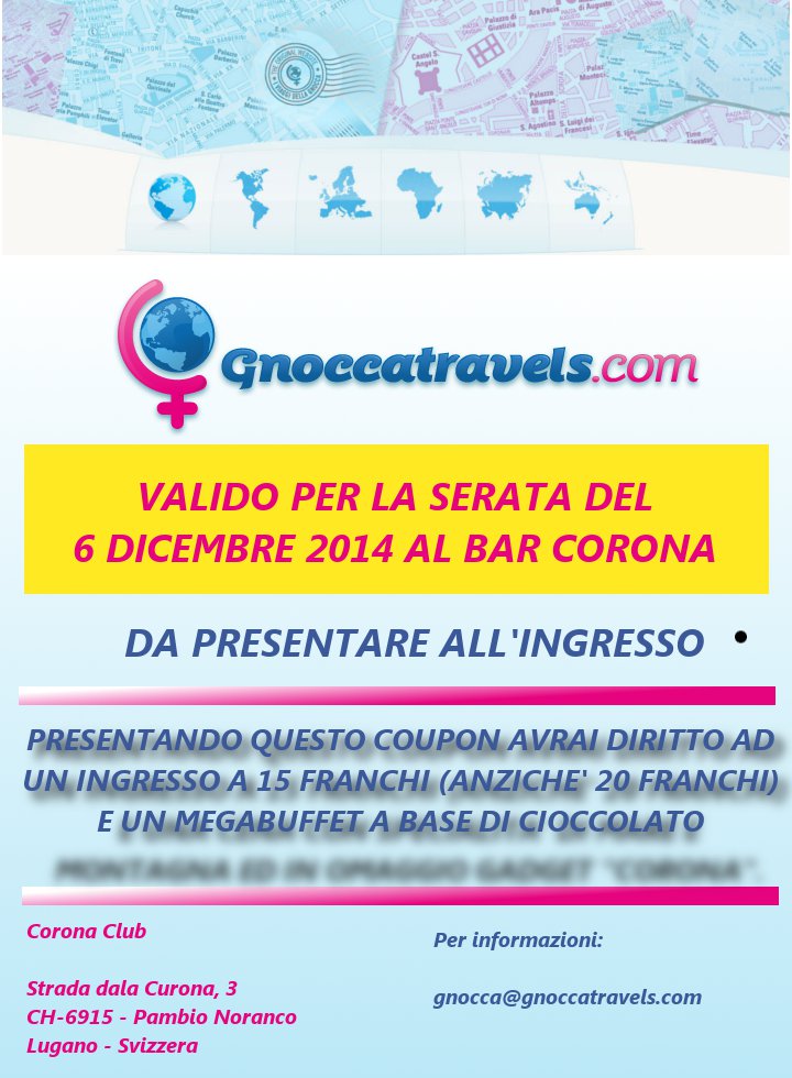 Anche questa volta,siamo riusciti ad ottenere (ringraziamo la proprietà del Corona) uno sconto di 5 Franchi (entrata 15 Franchi anziché 20 Franchi) dedicato esclusivamente agli utenti Gnoccatravels. Dovrete scaricare,come per l'ultimo evento,il coupon in allegato (a breve), stamparlo ed esibirlo all'ingresso o farlo vedere dal Vostro cellulare. L'entrata comprenderà una consumazione e un Mega Buffet a base di Cioccolato.