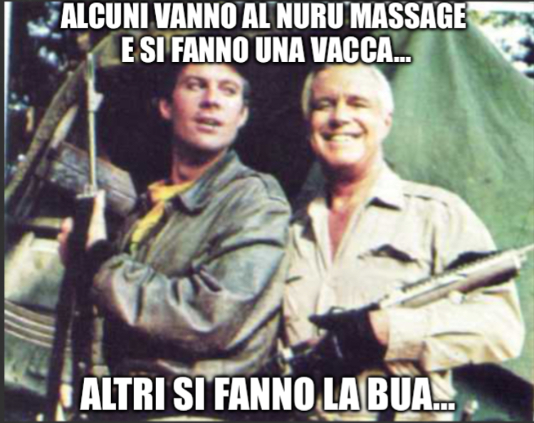 La ragazza, prontamente, ci mette una mano per evitare lo stampo della mia faccia stile Sacra Sindone sul bordo vasca. Maledetto l’architetto che ha progettato il tutto, al geometra che ha diretto i lavori e al muratore che ha posato il tutto: questa gente un massaggio nuru non lo ha mai fatto…