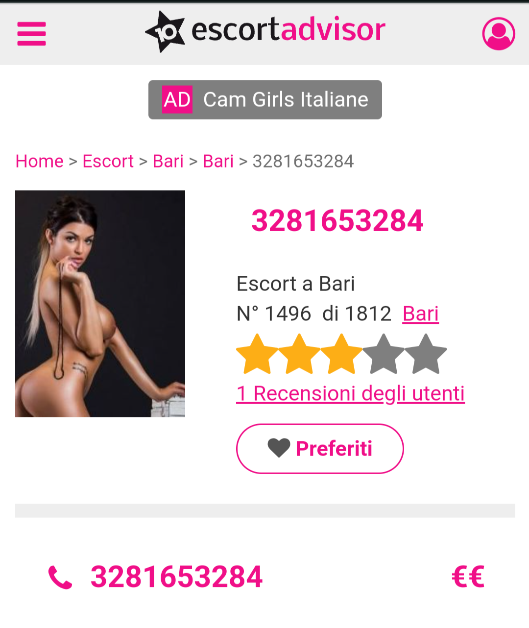 conoscete delle brave escort (niente puttane di strada) discrete a bari e dintorni? Ho cercato su escort forum, e ho fatto un paio di chiamate con scarsi risultati, ma essendo un novizio non sono fino a che punto fidarmi, e soprattutto non sono bravo a riconoscere le fregature.