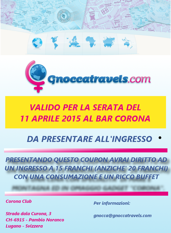 Anche questa volta,siamo riusciti ad ottenere (ringraziamo la proprietà del Corona) uno sconto di 5 Franchi (entrata 15 Franchi anziché 20 Franchi) dedicato esclusivamente agli utenti Gnoccatravels. Dovrete scaricare,come per l'ultimo evento,il coupon in allegato, stamparlo ed esibirlo all'ingresso o farlo vedere dal Vostro cellulare. L'entrata comprenderà una consumazione e un Ricco Buffet.