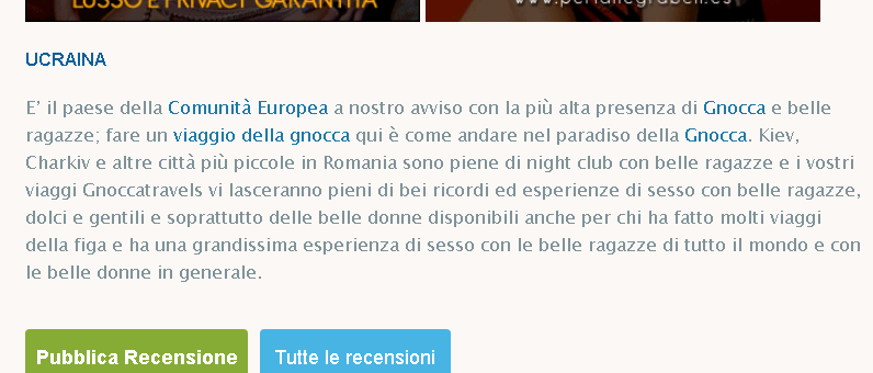 E’ il paese della Comunità Europea a nostro avviso con la più alta presenza di Gnocca e belle ragazze; fare un viaggio della gnocca qui è come andare nel paradiso della Gnocca. Kiev, Charkiv e altre città più piccole in Romania sono piene di night club con belle ragazze..."