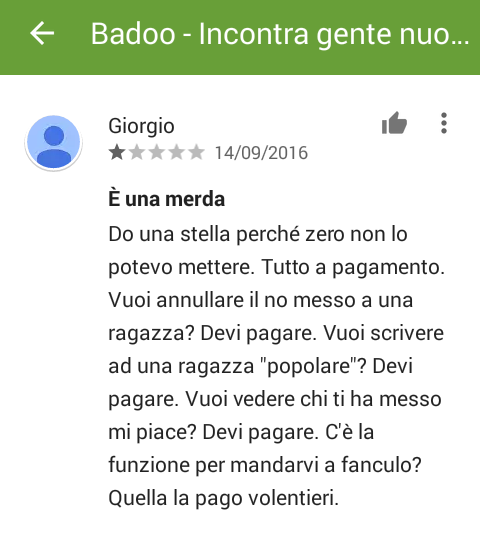 Non posso non condividere con voi questa opinione trovato su google play a proposito di badoo.... (della serie le app inutili per incontrare qualcuno)