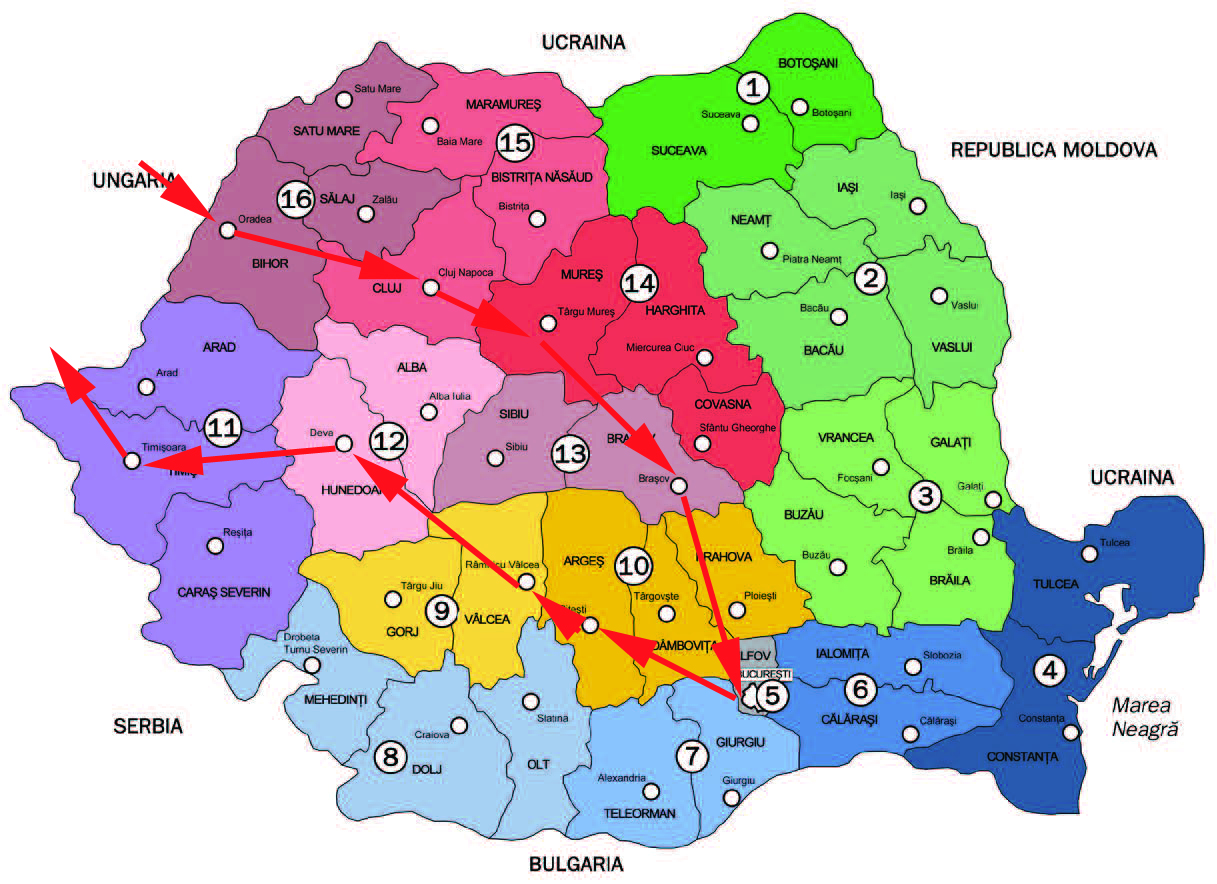 Al ritorno potresti fare da Bucarest - Pitesti - Ramnicu Valcea - Deva - Timisoara e rientro in Ungheria e Slovenia.