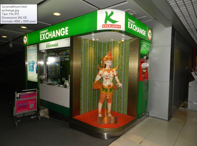 Al Suvarnabhumi due piani sotto gli arrivi internazionali c’ è un ufficio cambio che opera praticamente agli stessi tassi della città zona sukhumvit. E’ verde, ma attenzione, ce ne sono di verdi quasi similari dove invece il cambio è al normale standard aeroportuale. Comunque l’ ufficio giusto è inconfondibile per via della statua come si vede dalla foto allegata che ho scattato a suo tempo per dare un riferimento ad amici.