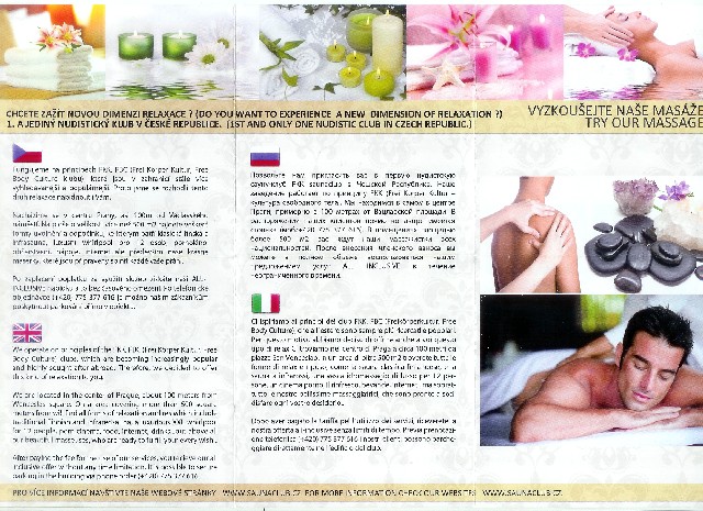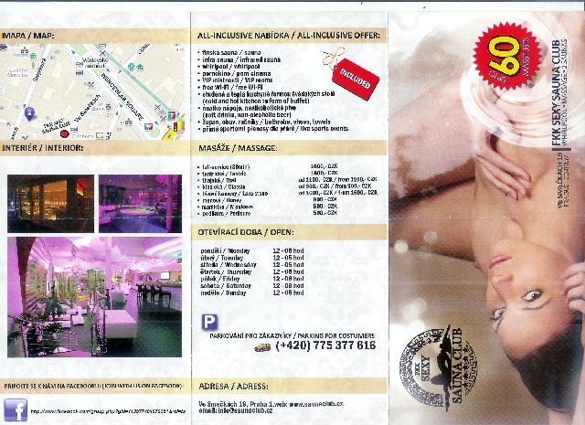 Potete osservare l'ambiente anche dal loro sito internet: http://www.saunaclub.cz/ oppure dare un'occhiata al volantino che posterò qui sotto per rendervi conto di prezzi, orari di apertura e servizi offerti.