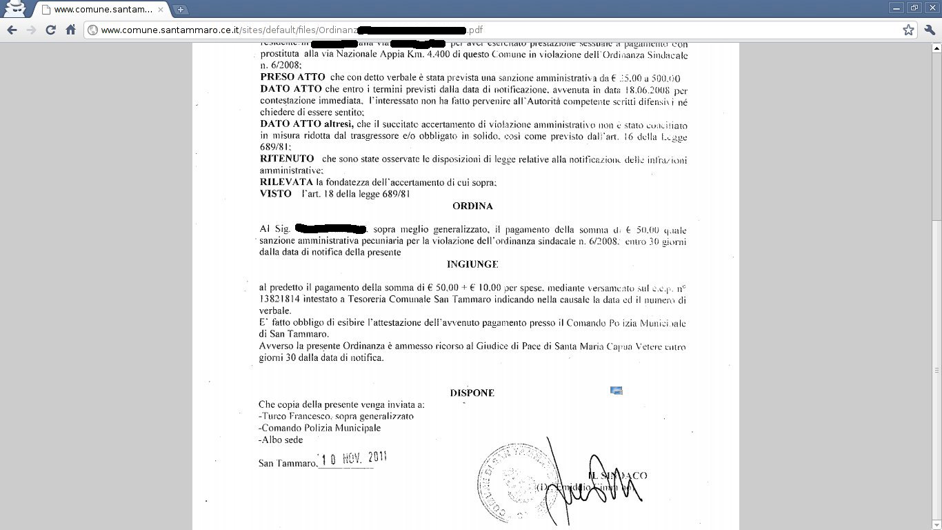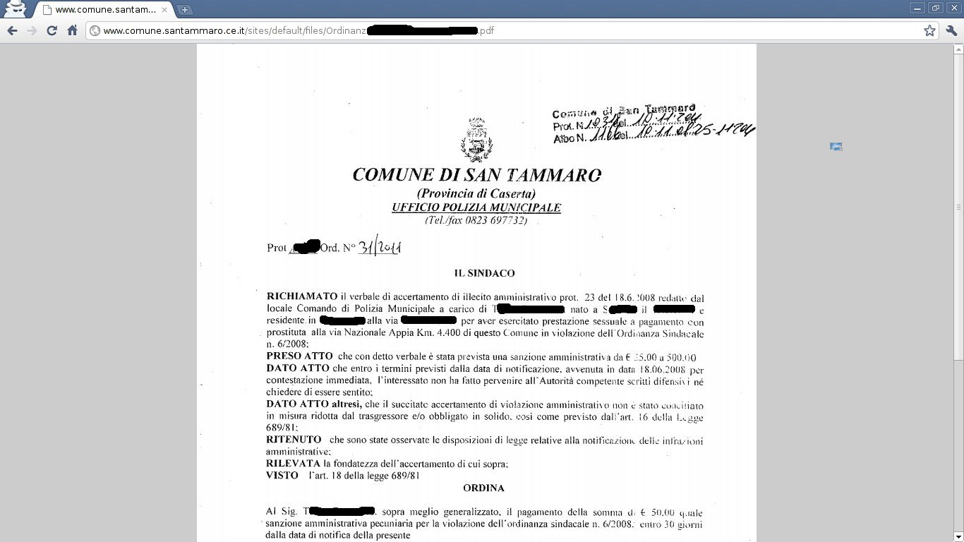 E allora perche' sul sito web del comune di San Tammaro c'e' nome, cognome e residenza di questo poveretto che oltre ad essere stato multato viene anche "sputtanato" pubblicamente?